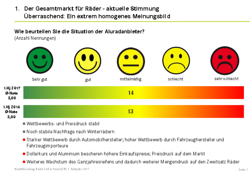 Im Segment Aluräder entwickelte sich der Sell-In-Mengenabsatz den Umfrageergebnissen zufolge im 1. Halbjahr 2017 im Vergleich zum Vorjahreszeitraum stabil mit leichter Aufwärtstendenz, auch die Prognose für das 2. Halbjahr ist leicht besser als im Vorjahr. Insgesamt wird damit für das Gesamtjahr ein höheres Mengenvolumen erwartet als noch zum Jahresanfang.