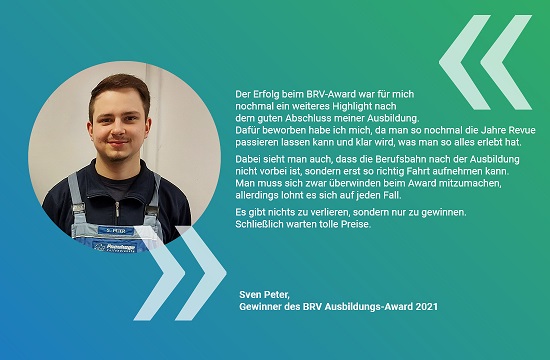 Warum sich die Teilnahme lohnt, erklärt Sven Peter, letztjähriger Gewinner im Wettbewerb um den BRV Ausbildungs-Award: „Der Erfolg beim BRV-Award war für mich noch einmal ein weiteres Highlight nach dem guten Abschluss meiner Ausbildung“, so sagt der Mechaniker für Reifen- und Vulkanisationstechnik, der bei Pneuhage in Bautzen seinen Beruf gelernt hat. „Dafür beworben habe ich mich, da man so nochmal die Jahre Revue passieren lassen kann und klar wird, was man so alles erlebt hat.“ Dabei sehe man auch, dass die Laufbahn nach der Ausbildung erst so richtig Fahrt aufnehmen kann. Sven Peters Fazit: „Man muss sich zwar überwinden beim Award mitzumachen, allerdings lohnt es sich auf jeden Fall. Es gibt nichts zu verlieren, sondern nur zu gewinnen. Schließlich warten tolle Preise.“