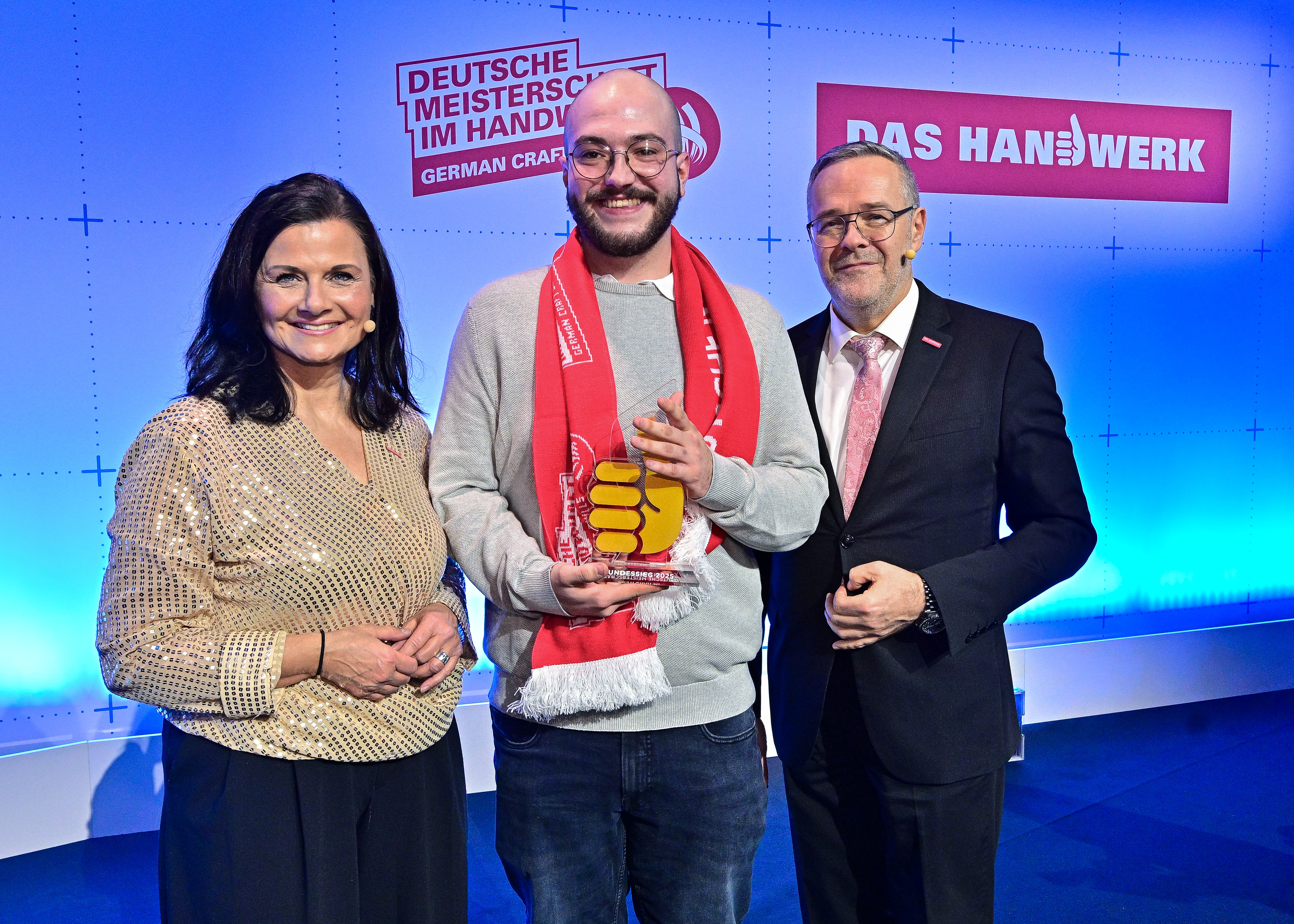 Deutscher Meister im Reifenhandwerk 2025: Max Sloot (Mitte) mit ZDH-Präsident Jörg Dittrich (r.) und Gitta Connemann, Parlamentarische Staatssekretärin im Bundeswirtschaftsministerium (l.), bei der Bestenehrung zur Deutschen Meisterschaft im Handwerk 2025 in Frankfurt/M. (Foto: ZDH/Martin Joppen & Peter Lorenz)