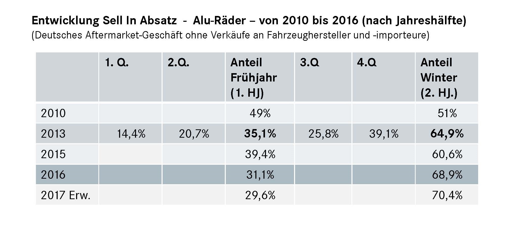 Ein Blick auf die Absatzzahlen von Alurädern im Jahresverlauf zeigt, dass sich – dem Trend der letzten Jahre folgend – das Umrüstgeschäft mehr und mehr auf die Wintersaison konzentriert. Entfielen in 2013 noch gut 35 Prozent des Absatzes auf das 1. Halbjahr, so rechnen die Panelteilnehmer für 2017 mit einem Rückgang des Frühjahrsgeschäftes auf knapp unter 30 Prozent. Mit Sorge beobachten sie deshalb den Trend zur steigenden Nachfrage nach Ganzjahresreifen und rechnen im Schnitt damit, dass dieser im Wintergeschäft 2017/2018 zu einem Rückgang des Ge-samtvolumens an Rädern im Ersatzmarkt um etwa fünf Prozent führen wird.