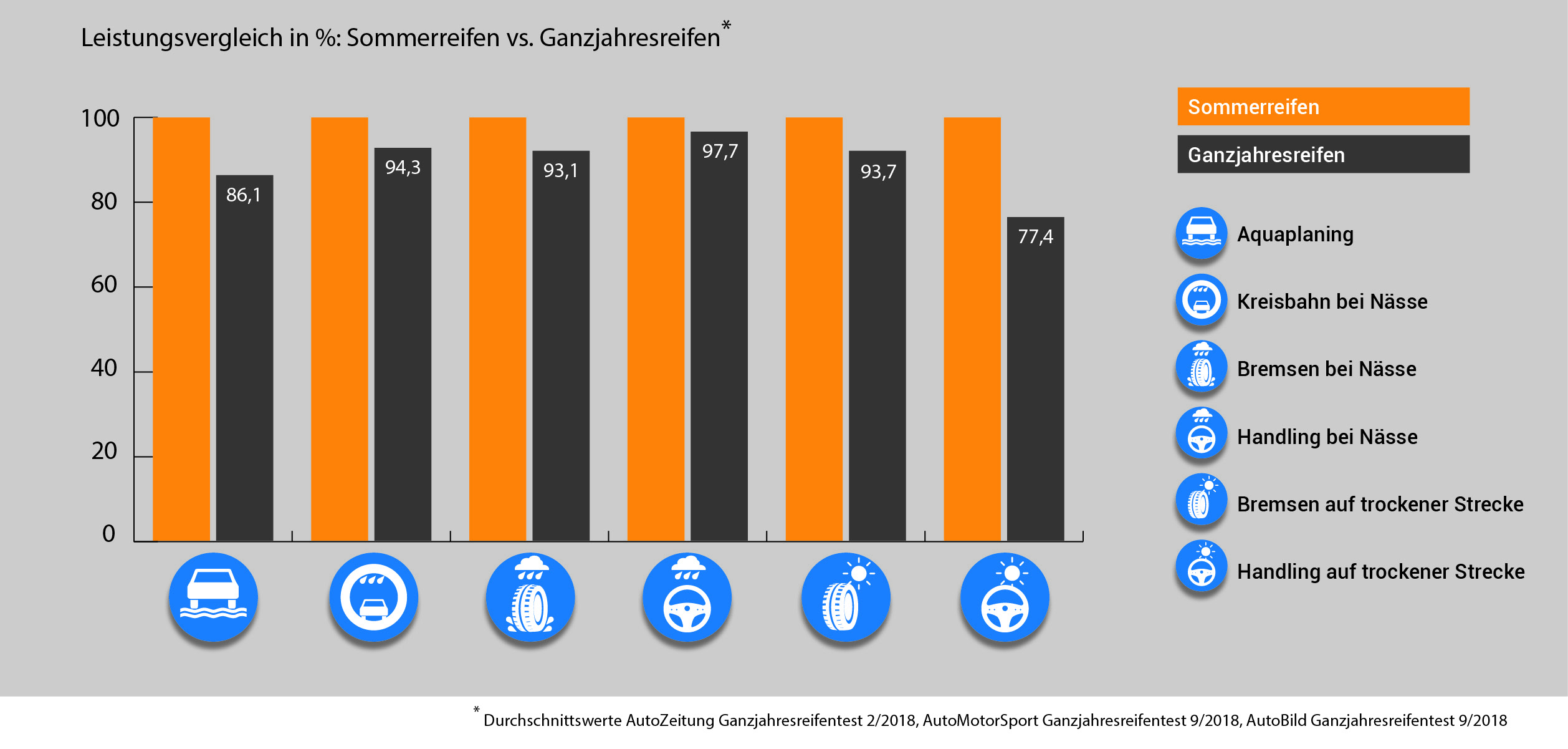 „Wir empfehlen ausdrücklich die Verwendung von Sommerreifen im Sommer“, sagt Yorick M. Lowin, Geschäftsführer des Bundesverbandes Reifenhandel und Vulkaniseur-Handwerk (BRV, Bonn), und begründet diese Empfehlung mit höherer Fahrsicherheit. Bei sommerlichen Straßenverhältnissen sind vor allem das Bremsverhalten auf nasser und trockener Straße für die Sicherheit relevant – zwei Disziplinen, in denen Sommerreifen aufgrund anderer Materialmischung und Profilgestaltung bei warmen Temperaturen gegenüber Winterreifen deutlich kürzere Bremswege aufweisen. Auch gegenüber den zunehmend beliebten Ganzjahresreifen haben die Sommerspezialisten die Nase vorn: Betrachtet man etwa die in einschlägigen Reifentests erzielten Ergebnisse hinsichtlich Aquaplaning, Nass- und Trockenbremsen im Durchschnitt, liegen die mitgetesteten Sommerreifen zum Teil deutlich besser als die Ganzjahresreifen, die ausschließlich aus dem Premium- und Qualitäts-Segment kamen.