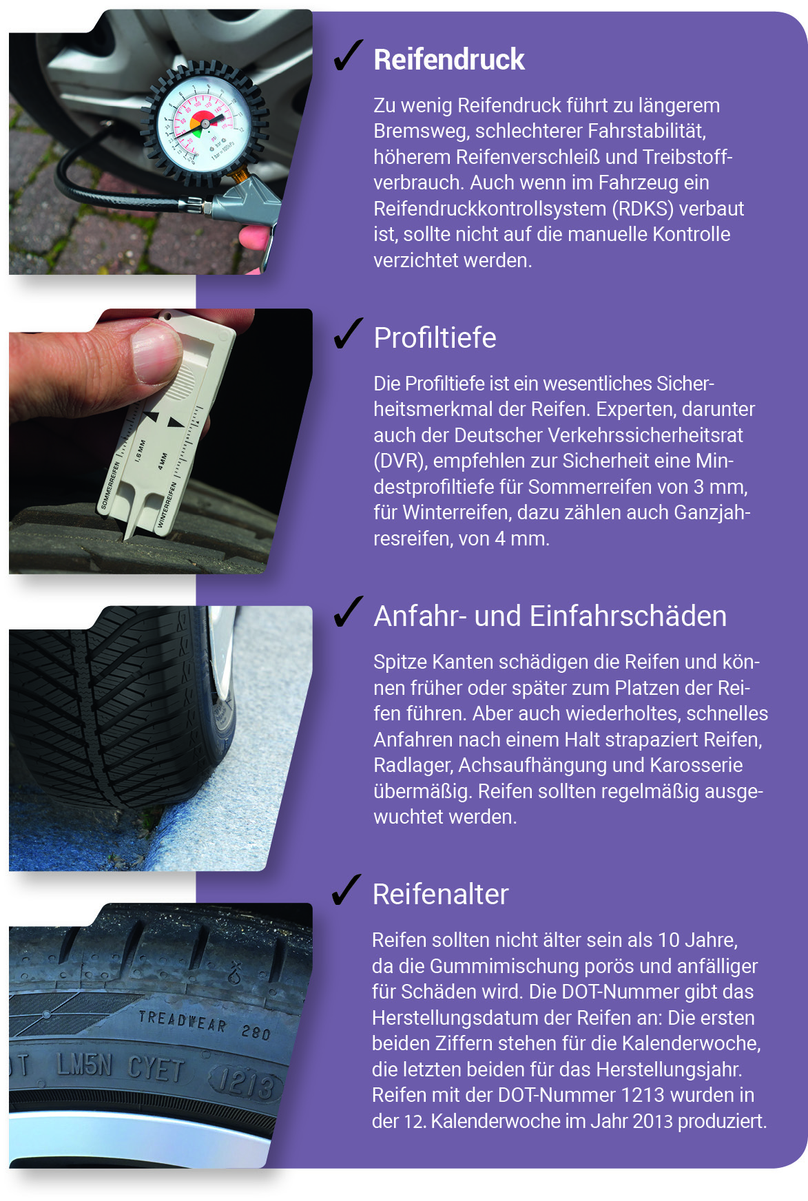 Doch auch ein Ganzjahresreifen ist kein „Rundum-Sorglos-Paket“, jedenfalls nicht für Autofahrer, die Wert auf größtmögliche Fahrsicherheit legen. Im Gegenteil: Da die Allrounder eben nicht wie Sommer- oder Winterreifen beim jährlichen Umrüst-Termin automatisch auf ihren Zustand und ihre Verkehrstauglichkeit geprüft werden, sollten deren Nutzer selbst dafür Sorge tragen, dass sie mindestens einmal im Jahr vom Fachmann gecheckt werden – der DVR empfiehlt sogar halbjährliche Reifenchecks. „Ausschlaggebend für die Reifensicherheit sind der richtige Reifenluftdruck, eine ausreichende Profiltiefe – im Sommer für optimale Fahrsicherheit mindestens 3 mm -, ein Reifenalter von höchstens zehn Jahren und die Freiheit von An- oder Einfahrschäden“, erläutert Reifenexperte Hans-Jürgen Drechsler. Das Durchfahren von Schlaglöchern oder ein Schleifen an der Bordsteinkante ist meist schnell vergessen, hinterlässt am Reifen aber oft bleibende Sicherheitseinbußen in Form von Mängeln oder Unwuchten. „‘Otto Normalautofahrer‘ sollte seine Reifen deshalb mindestens vor geplanten Urlaubsfahrten einer Prüfung unterziehen – am besten vom Reifenexperten“, legt Drechsler den Kfz-Haltern ans Herz.